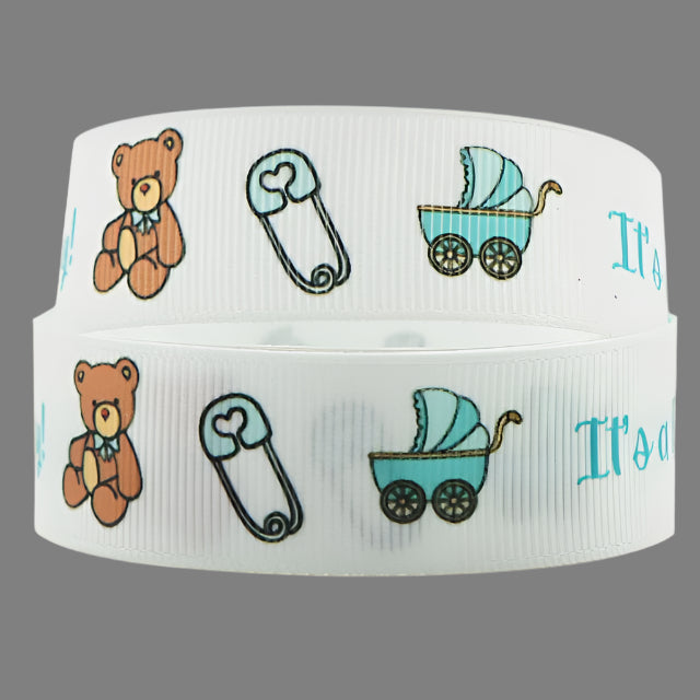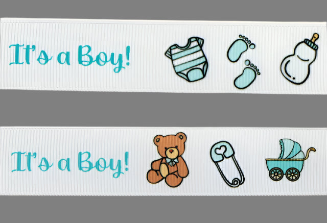 This blue grosgrain ribbon is perfect for your baby shower decorations. Made of high-quality material, it features a charming "It's A Boy" print, adding a special touch to your celebration. The soft texture and delicate design make it ideal for wrapping gifts, creating bows, and more. Show off your excitement in style with this adorable baby ribbon.