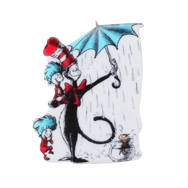 This Cat in the Hat Flat Back Planar Resin figurine features a charming design of the beloved Dr. Seuss character sheltered under a whimsical umbrella as it stands in the rain. Made with high-quality resin, this figurine will add a touch of nostalgia to any home décor.