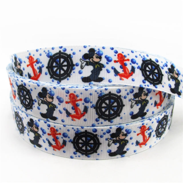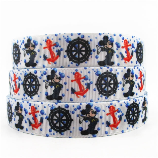 This grosgrain ribbon showcases beloved Disney character Mickey Mouse, along with iconic ship's wheel, anchor, and water droplets design. Perfect for adding a touch of whimsy to any project or gift, this ribbon is a must-have for any Disney fan. Add a magical touch to your crafts with this Disney Cruise Line ribbon.
