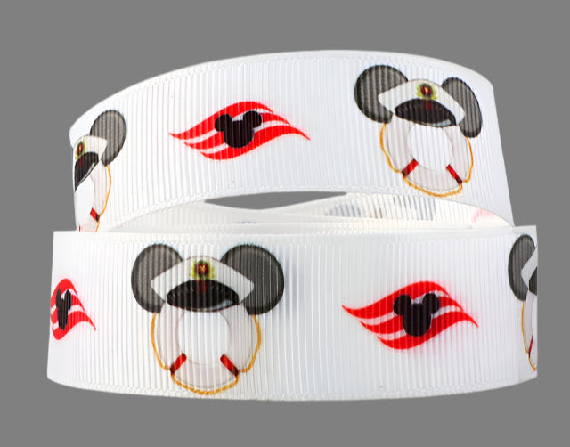 Add a touch of Disney magic to your crafting projects with our Disney Cruise Line ribbon. Made of high-quality grosgrain, it features a life preserver shaped like Mickey and the iconic wave logo of the Disney Cruise Line. Perfect for any Disney enthusiast, this ribbon is available by the yard for all your crafting needs.