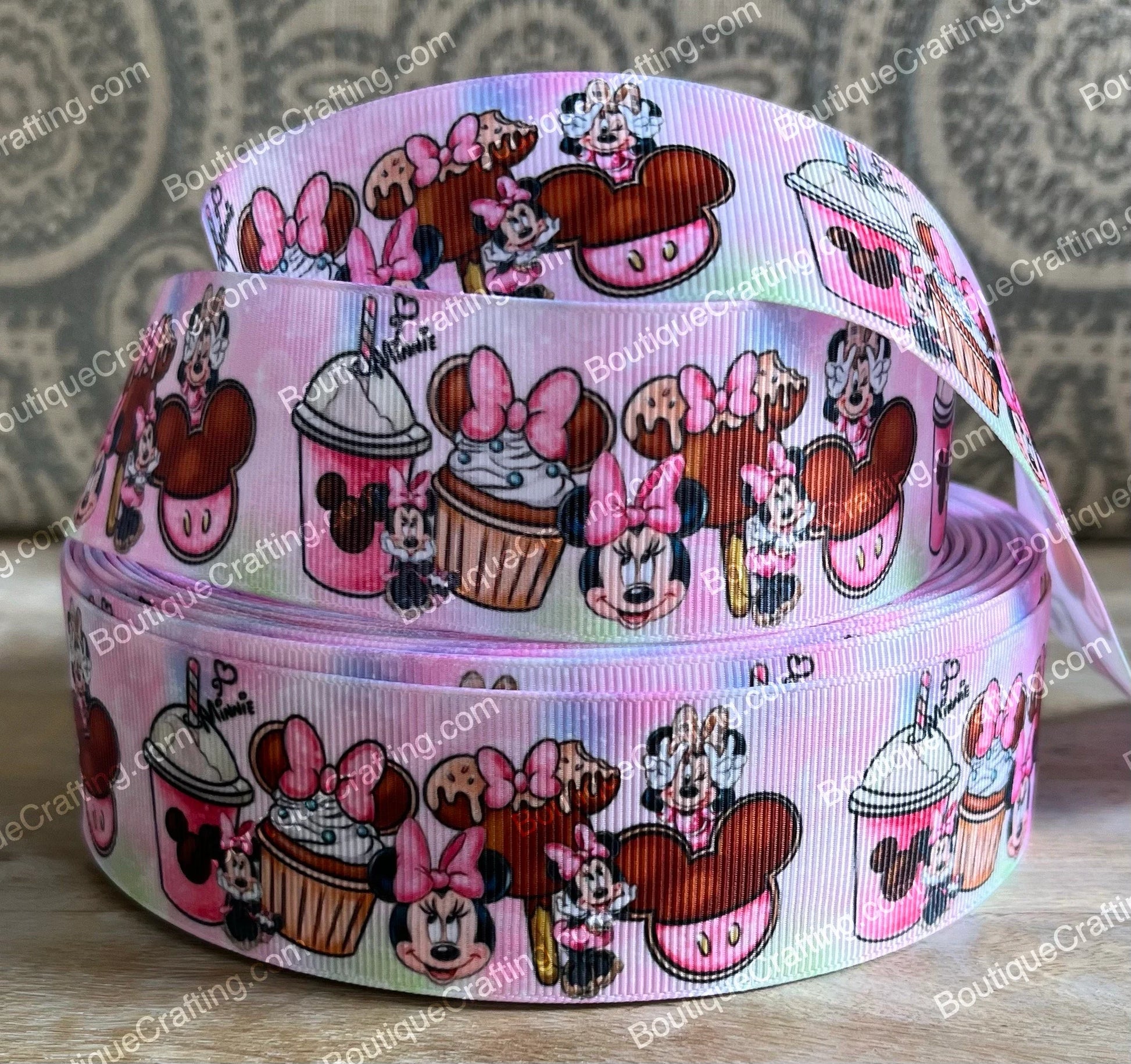 Elevate your crafting projects with our Disney Park Treats Grosgrain Ribbon featuring Mickey-shaped cupcake, drink and treats designs. This high-quality grosgrain ribbon captures the whimsical essence of Disney parks' beloved treats, perfect for scrapbooking, gift wrapping, hair accessories, or adding magical touches to handmade items. The durable construction ensures lasting color and shape through multiple projects.