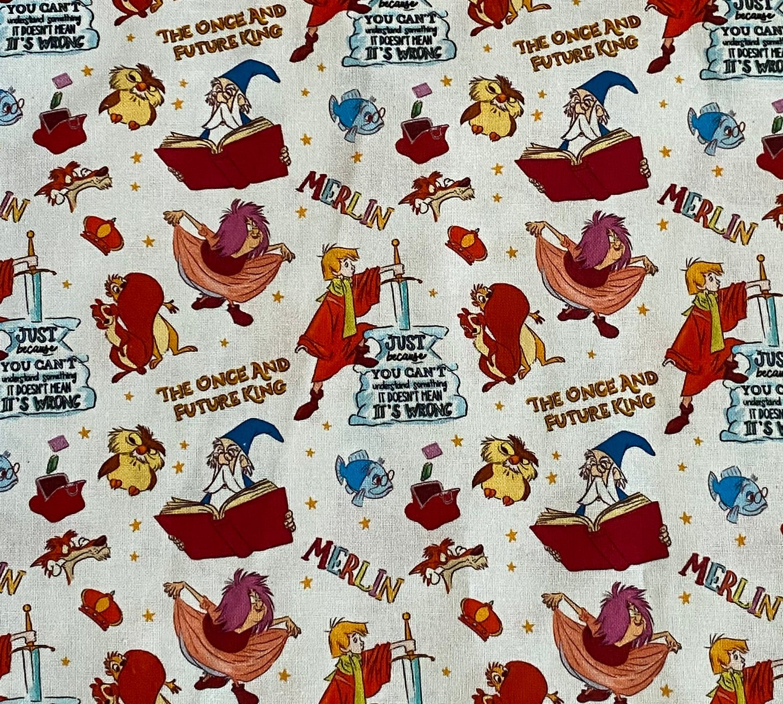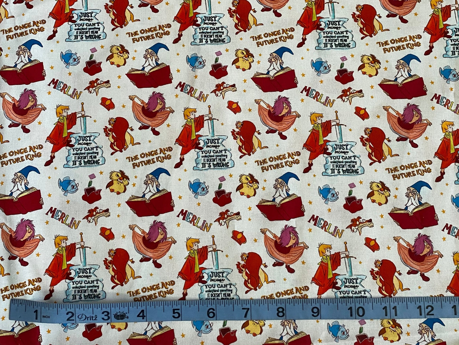 Experience the magic with Disney's Sword and the Stone Fabric. Featuring iconic characters Merlin, Arthur, and Madam Mim, this high-quality fabric brings the beloved story to life. Perfect for any project, let your creativity soar with this enchanting fabric.