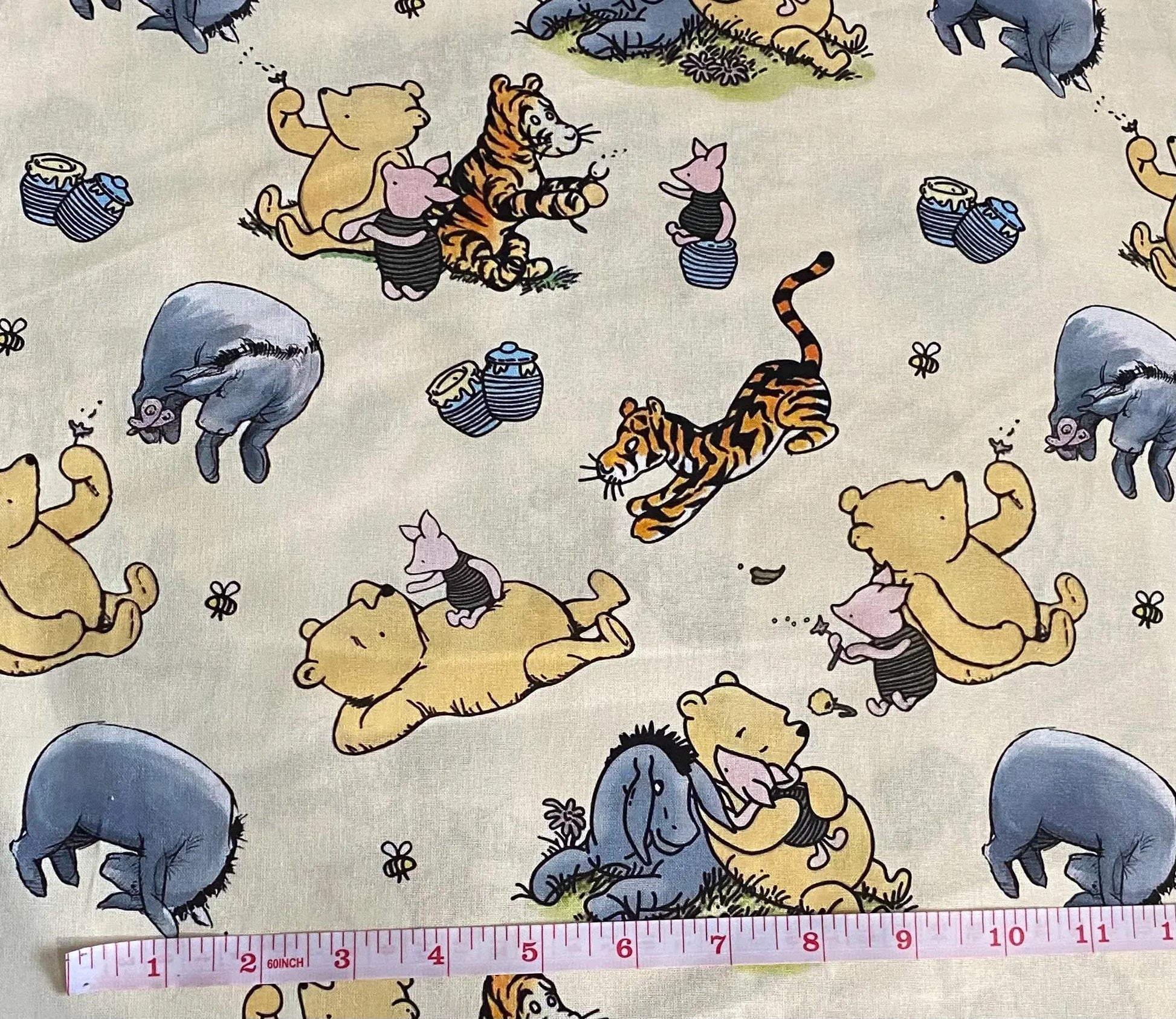 This classic style Disney Winnie The Pooh fabric is made of 100% cotton and features beloved characters Pooh Bear, Eeyore, Tigger, and Piglet. Perfect for any fan of the Hundred Acre Wood, this fabric is soft and versatile for all your sewing and crafting needs.