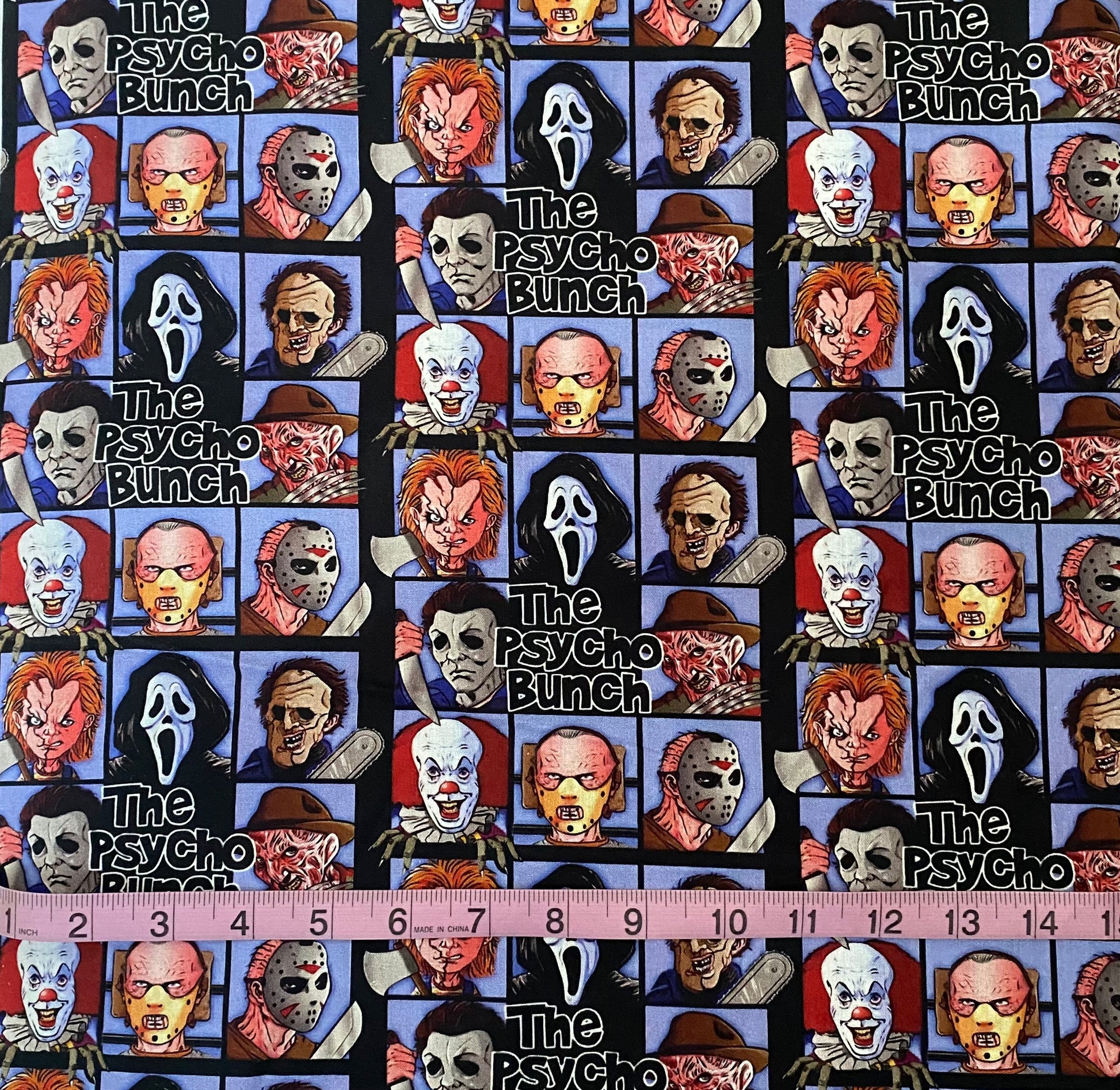 Experience the ultimate scare with our Horror Fabric featuring iconic horror figures such as Scream, Pennywise, Jason, and Freddy. Perfect for Halloween decorations or horror movie marathons, this fabric will surely add a chilling touch to your space. Don't miss out on the terror.