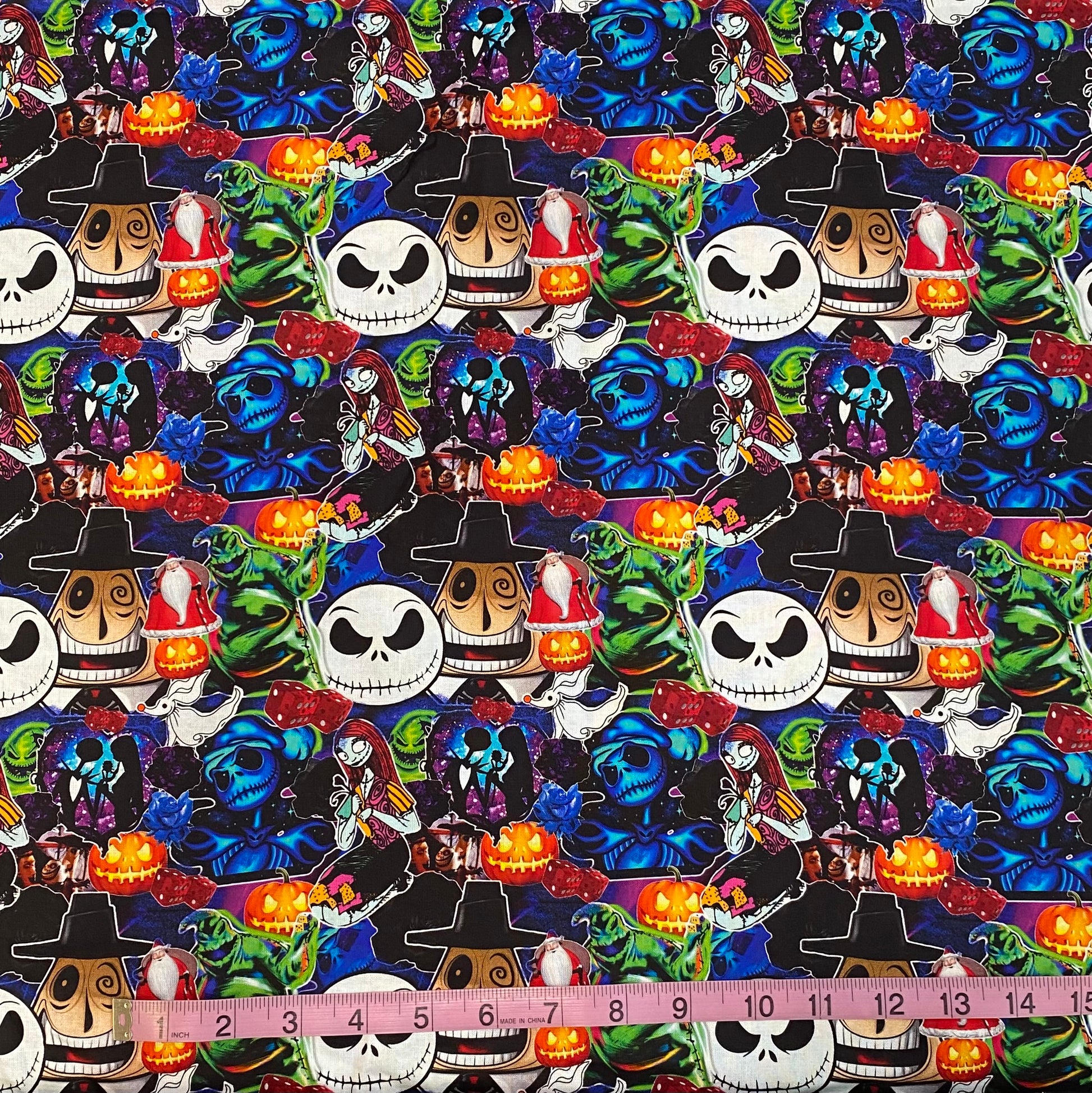 Celebrate the spooky charm of Halloween and Christmas with this Nightmare Before Christmas fabric featuring Jack, Sally, and Oogie Boogie. Perfect for crafting unique decorations, costumes, or gifts that capture the magic of this beloved classic.